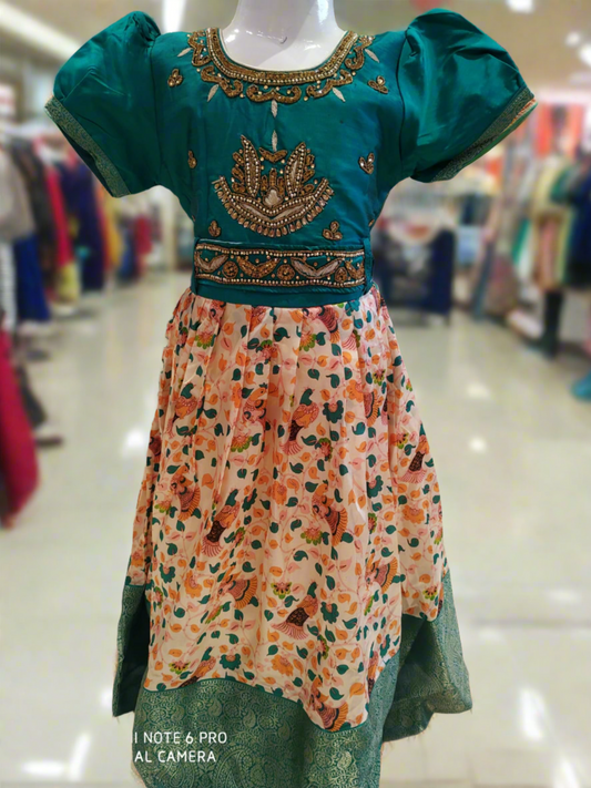 girls festive wear , beautiful frock/ gown, kalamkari print , green ( e 48)