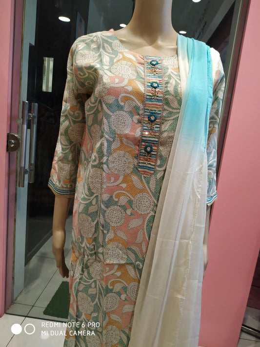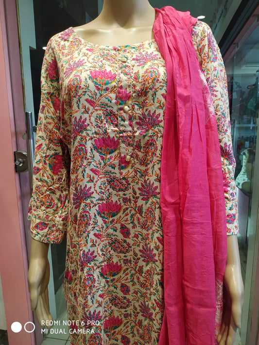 Women's kurti set with pant and dupatta, white&pink/blue( Lfst 44)