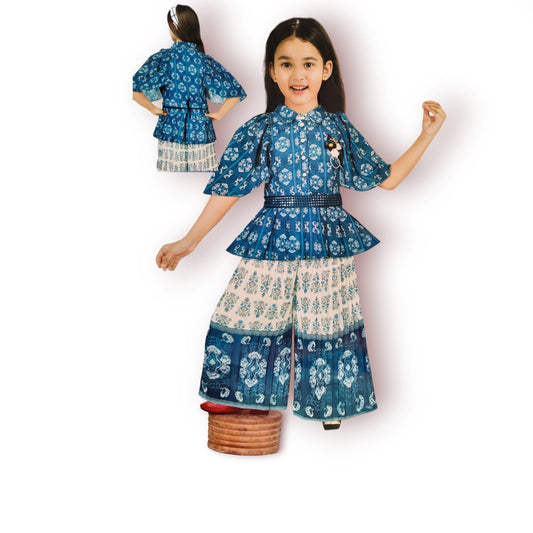 girls western stylish white and blue top-plazzo set ( Z 17)