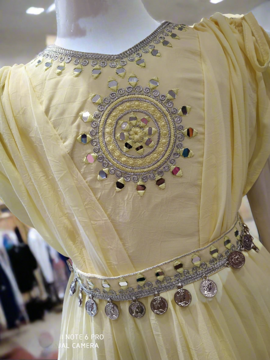 Flayered Umbrella long frock, yellow chanderi ( e 59 )
