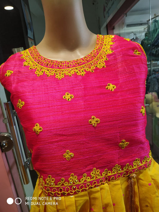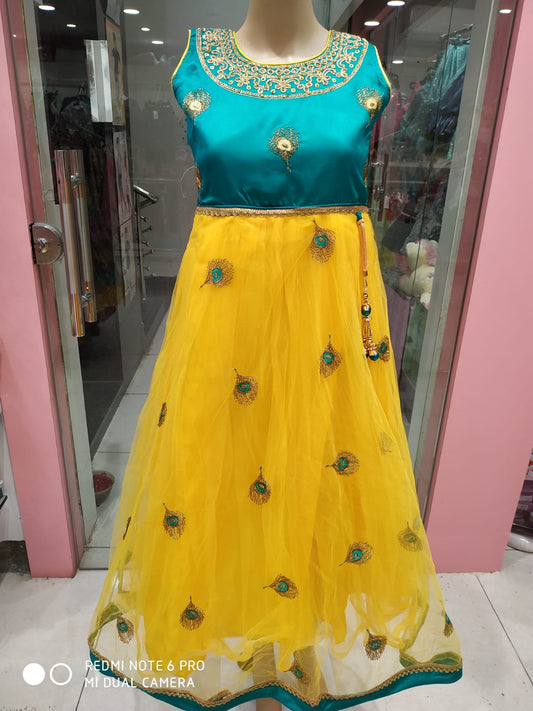 girls festive wear , beautiful frock/ gown, yellow & pink/green ( e 34)